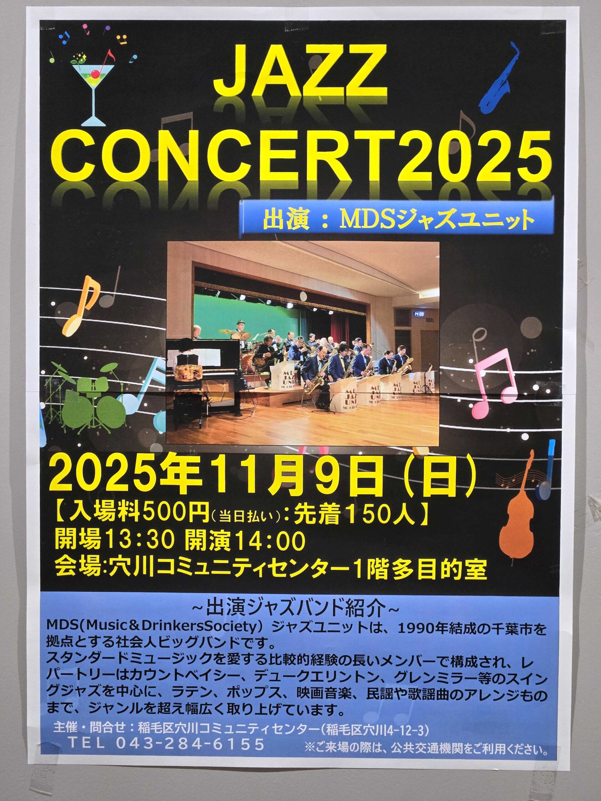 MDSジャズユニットの秋のコンサートが11月9日(日)に穴川コミュニティセンターの多目的ホールで開かれました。